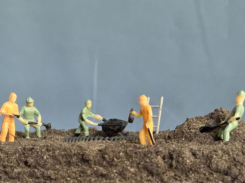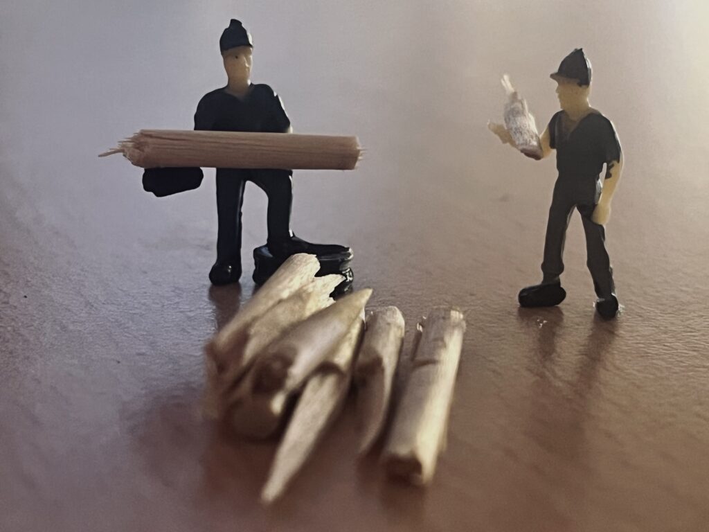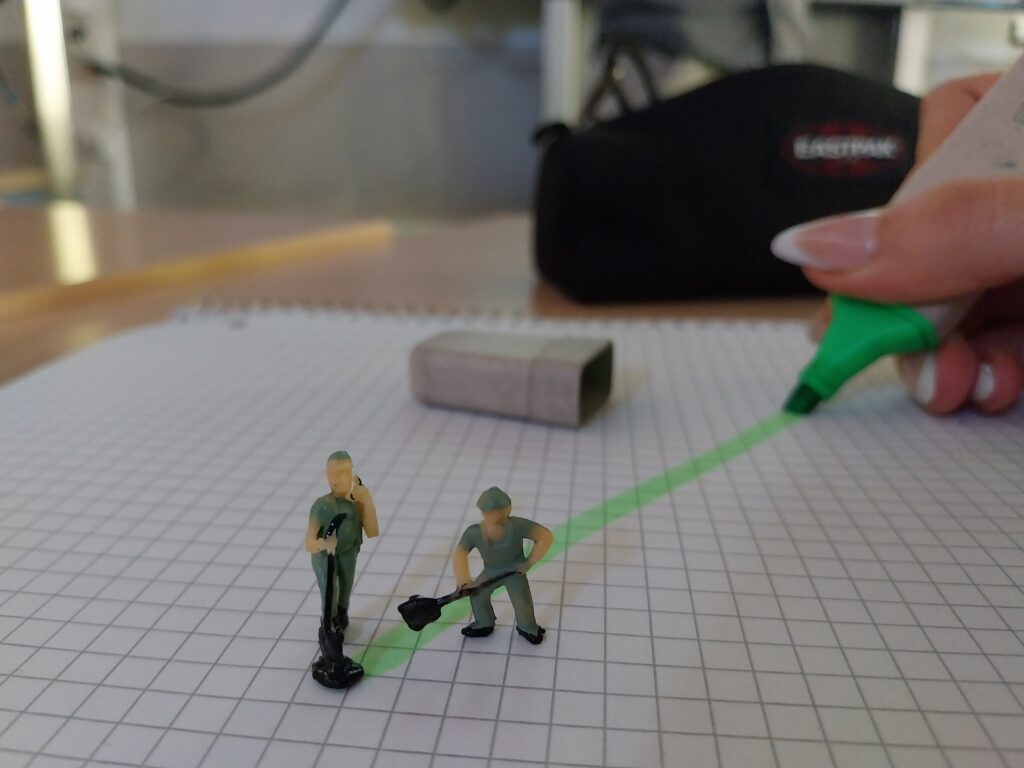 Auf den weiteren Aufnahmen haben die SuS mit dem Makromodus experimentiert. Kleine Dinge sollen hier ganz nah herangeholt werden, und was eignet sich besser dafür als kleine Modelleisenbahnfiguren? Bei den Fotos handelt es sich um eine Spielart der Tabletop-Fotografie: Die Figuren sollten in alltäglichen Situationen dargestellt werden, allerdings nicht unbedingt mit den dafür gewöhnlichen Gegenständen.