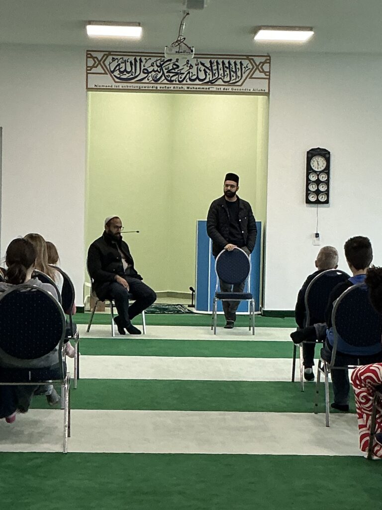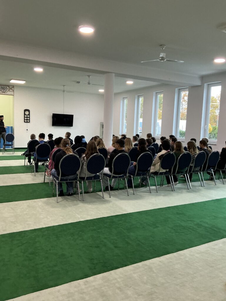 Herzlich empfangen wurden die Schülerinnen und Schüler vom Imam der Gemeinde, Herrn Ahmad, der sich viel Zeit nahm, um die Besucherinnen und Besucher durch die Moschee zu führen und Fragen rund um den Islam zu beantworten. Die Sami-Moschee gehört zur Ahmadiyya Muslim Jamaat, einer muslimischen Gemeinde, die sich für Frieden, Toleranz und interreligiösen Dialog engagiert.