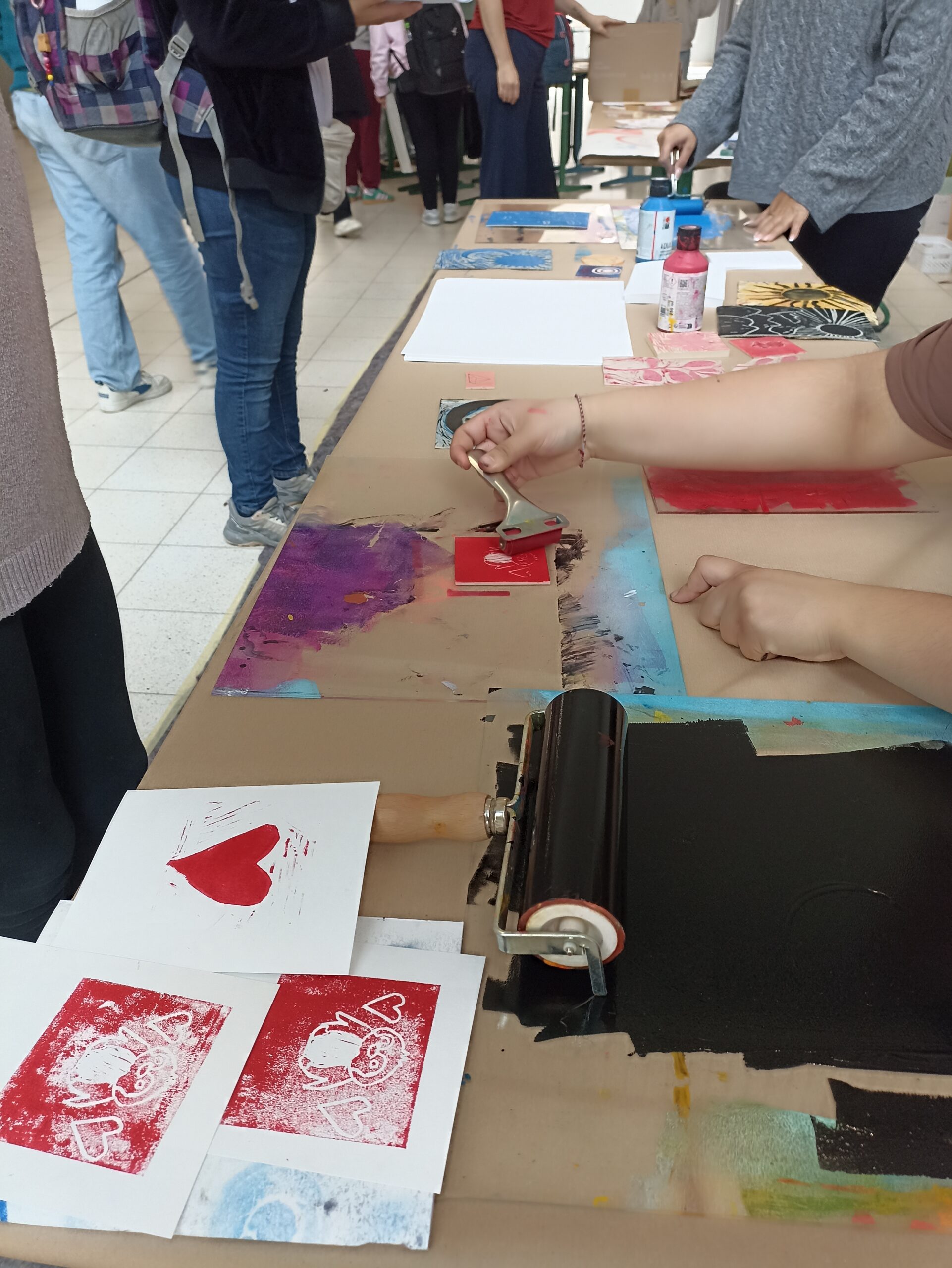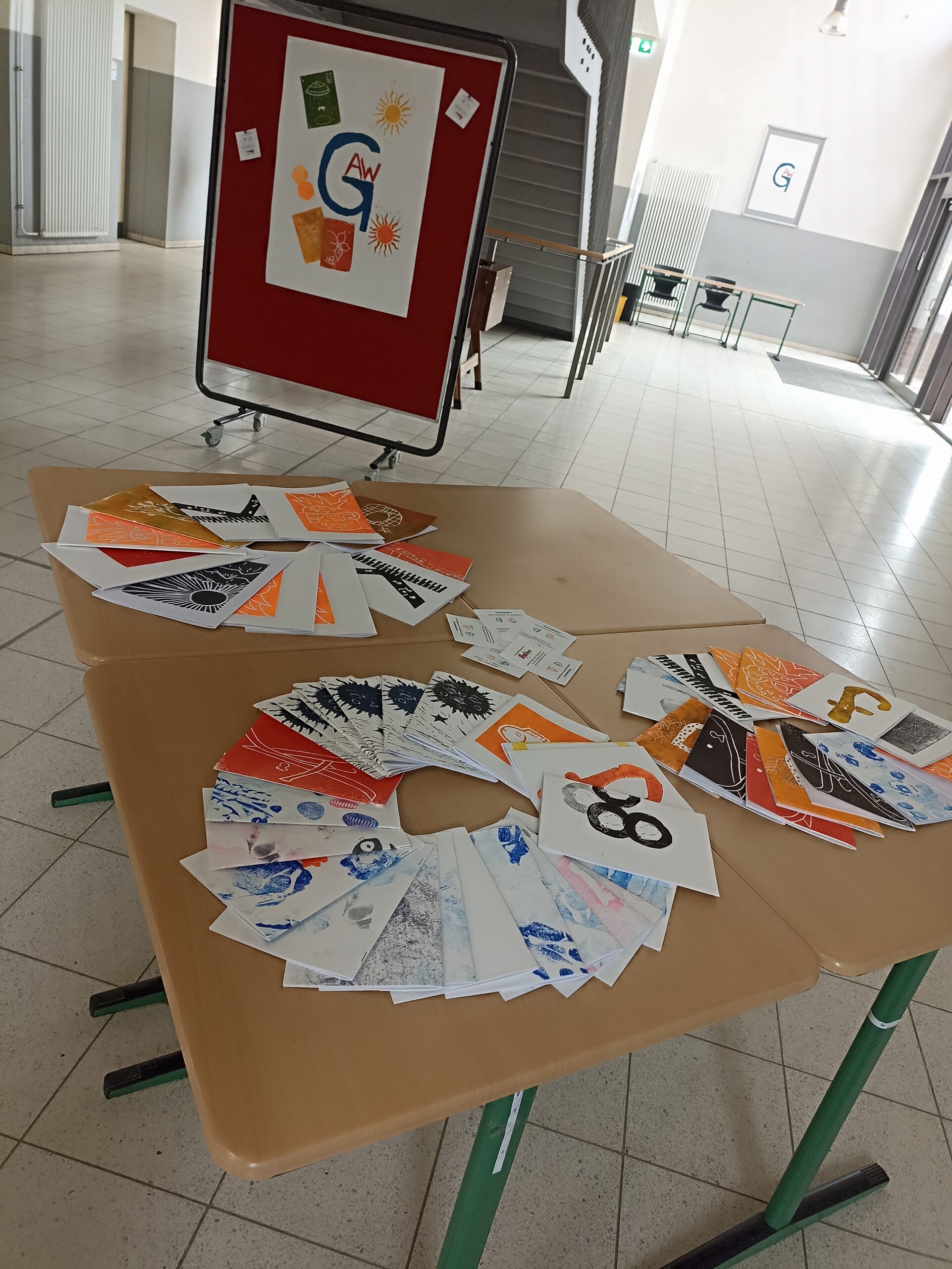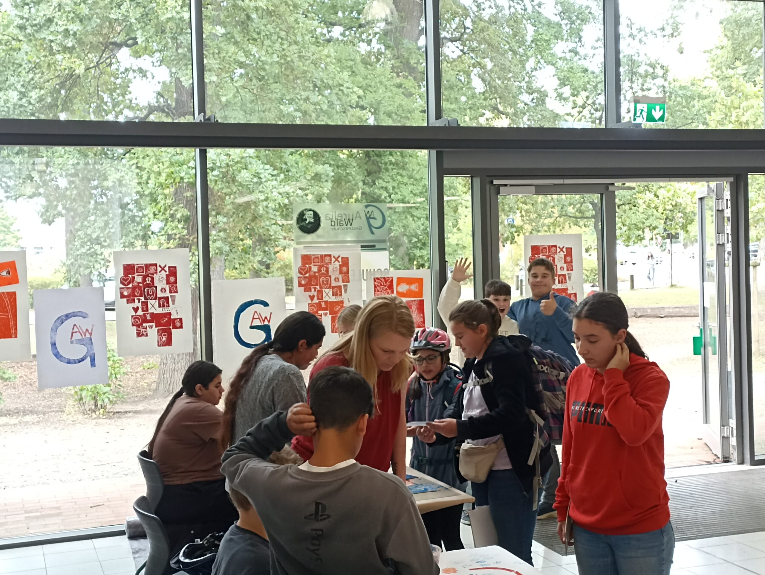 Besonders der 5. Jahrgang durfte einen intensiven Einblick in die Druckkunst erhalten. Alle weiteren Klassen hatten während der Mittagspause die Möglichkeit, die Ausstellung zu besuchen, die entstandenen Werke zu bestaunen und an den Mitmachstationen selbst aktiv zu werden. Gegen eine Spende konnten Besucher zudem selbstgestaltete Notizhefte sowie A3- und A4-Drucke erwerben.